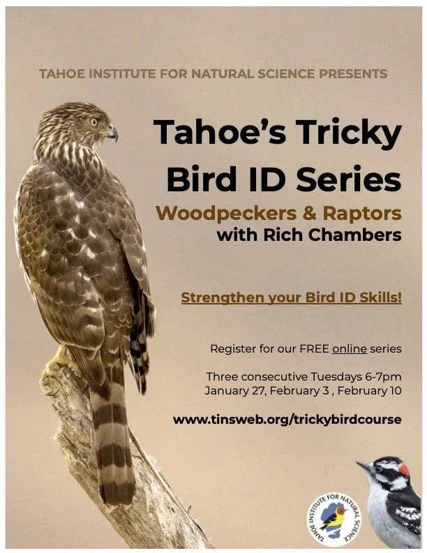 Join us for a free, fun, and informative 3-part online class series where Rich will guide participants through some of the toughest bird ID challenges specific to the Tahoe and Truckee region. Through expert tips, clear comparisons, and real world examples, you’ll sharpen your skills and gain confidence in identifying these tricky species.